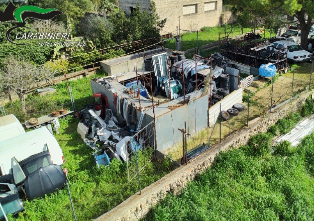 Taranto: "Scoperto autodemolitore illegale, con discarica di parti di veicoli e auto rubate cannibalizzate."